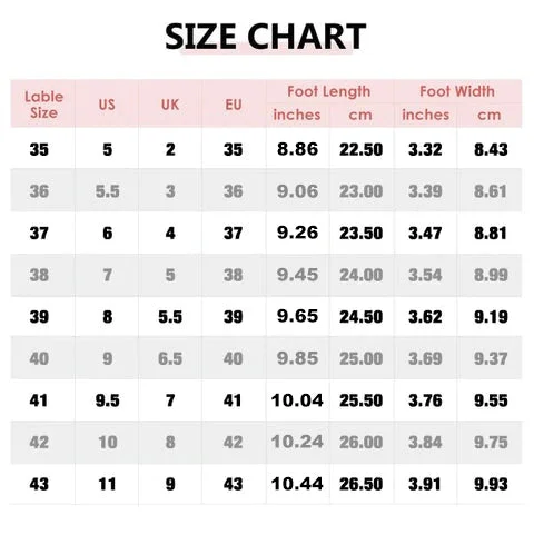 2.Once you know your foot length, consult the Size Chart to determine which  size you should purchase. Some tags’ UK/US size number may be different from our size chart’s UK/US size number, please take our size chart as the standard reference.